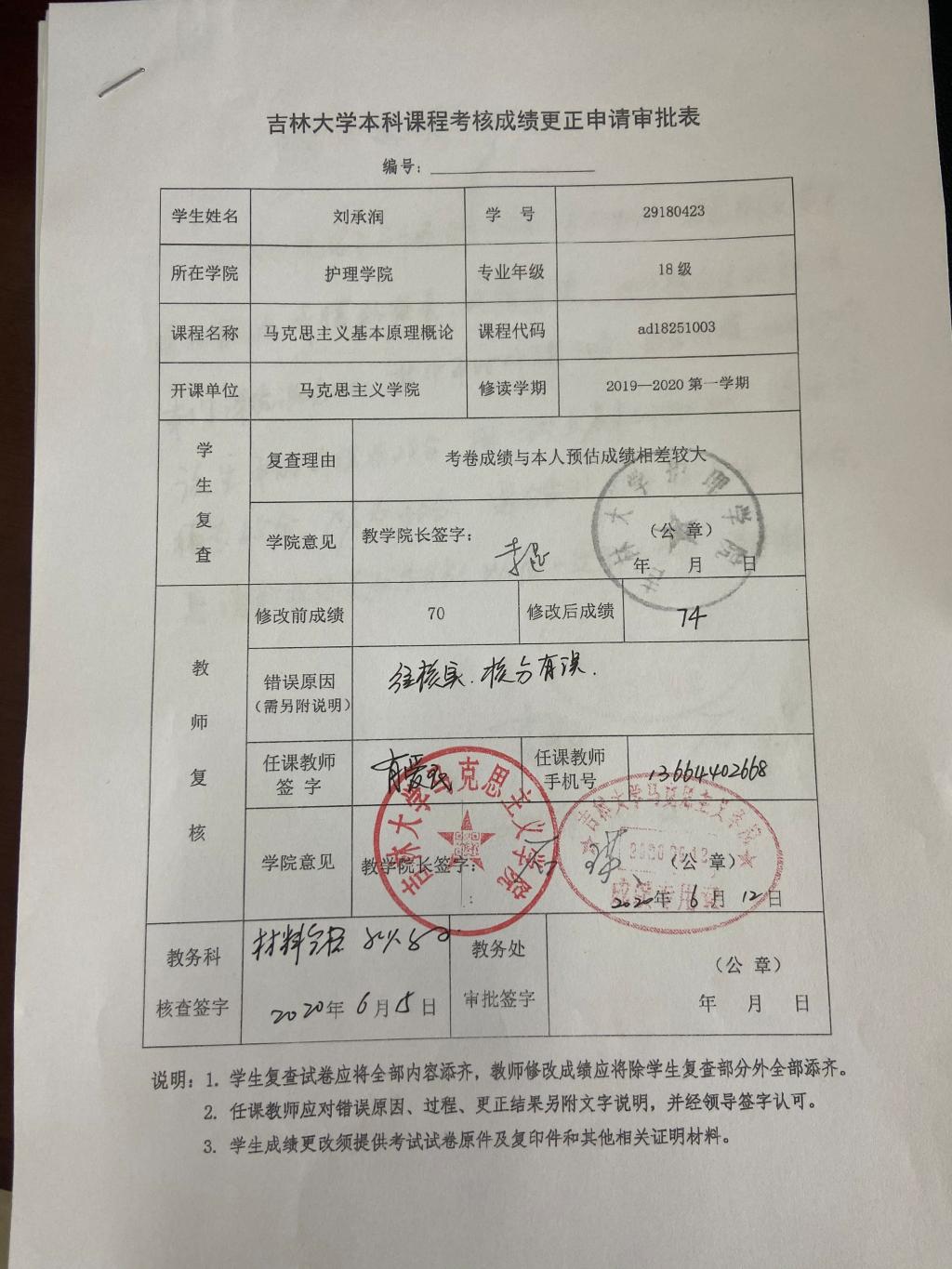 根据《关于进一步明确本科生课程考核等有关问题的通知》(校教字〔2018〕47号)文件有关精神,现对国产无码 2018级刘承润同学(学号:29180423)2019-2020-1学期课程成绩更正如下:
