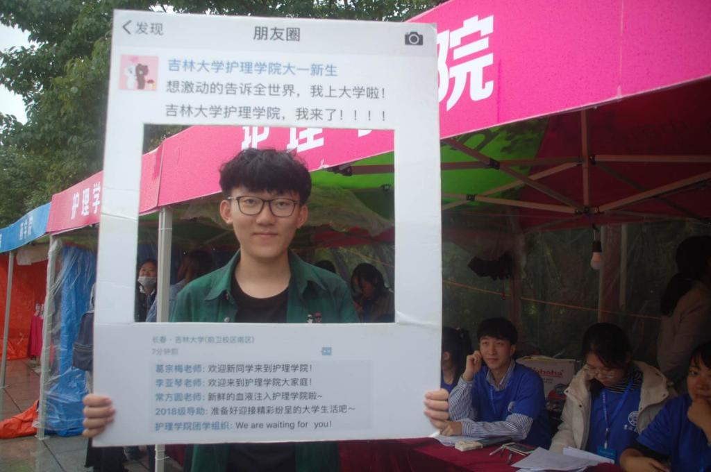 早上7点,迎新现场一切备置妥当。雨势不减,陆续到来的新生及家长们在帐篷前有秩序地排队,依次办理报到手续。学院在迎新现场开设签到区、材料领取区、银行卡发放区、信息录入区和绿色通道区,为新生提供最快,最方便的流程办理,确保新生准确无误地完成报到。同时,学院设置流动志愿者作为新生向导,往返于新生寝室与五月花广场之间,热情地帮助新生搬运行李,解答新生与家长们的疑惑,帮助他们更深入地了解护理与康复专业。工作人员还模仿朋友圈模式制作了一个合影相框,为新生第一天入学报道留下了美好纪念。